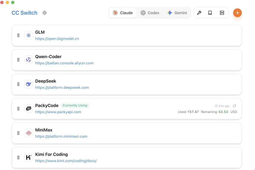 - 多合一配置管理:在一个面板中统一管理 Claude Code、Codex、Gemini CLI 等工具的 API 配置。