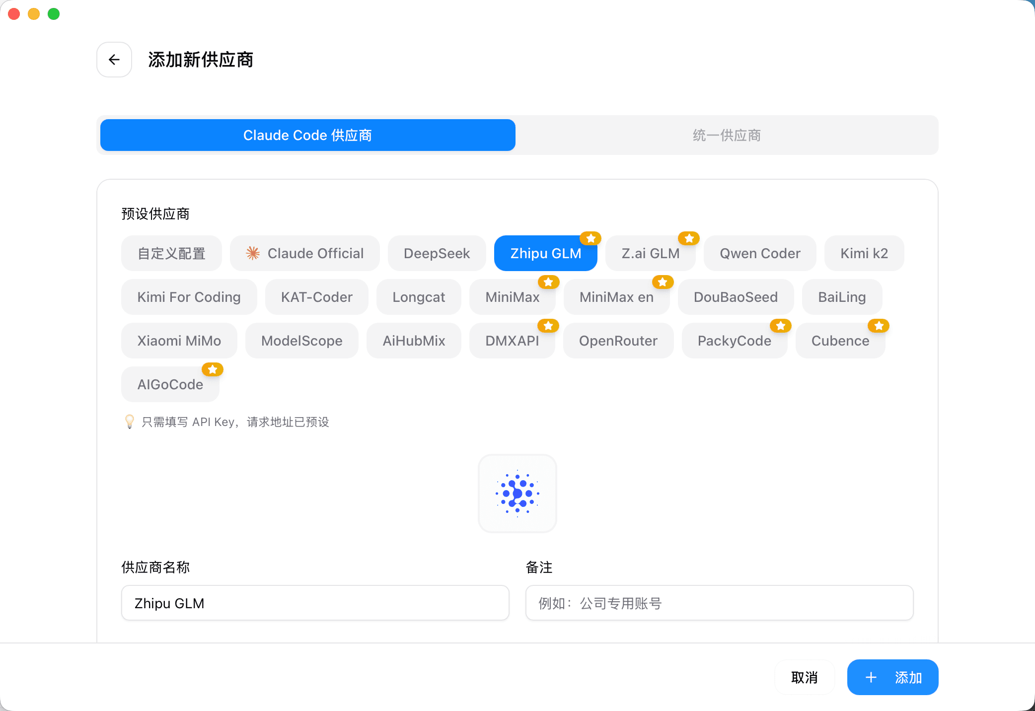 - 添加供应商 Provider:点击界面上的 "Add Provider",选择预设模板或手动自定义配置。